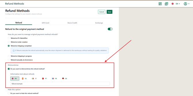 Ability to configure and manage the refund disincentive text