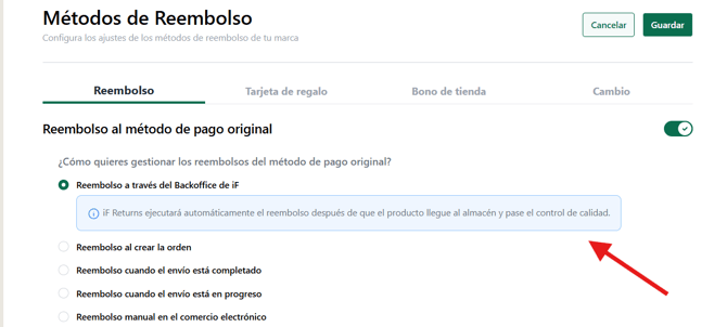 Agregamos explicaciones claras debajo de cada opción de activación para eliminar cualquier duda sobre quién ejecuta y cuándo se ejecuta el reembolso