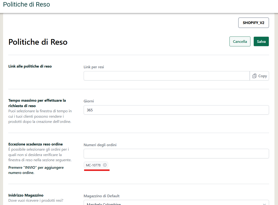 Se un ordine è incluso nell'elenco delle eccezioni, dovrebbe sempre essere consentito di avviare un reso, indipendentemente da altre regole o condizioni attive.