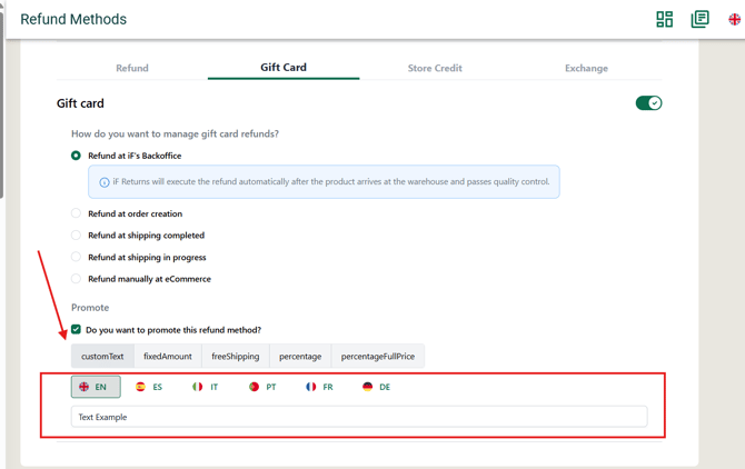- Una nuova opzione per aggiungere testo personalizzato alla carta regalo, al credito del negozio e allo scambio.